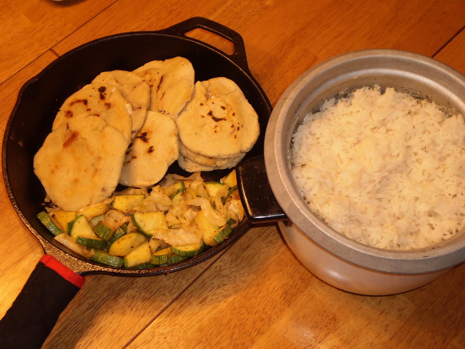 Pan fry them a couple minutes on each side. I sprinkled a little salt on top of them to add a touch of flavor. I made them pretty mild so the kids would like them, but you could stuff them with jalapenos or other spicy stuff. It would be good with salsa, sour cream, cilantro, or anything else you might eat with tortillas. They eat pupusas in El Salvador with a pickled cabbage; since I didn't have time for the pickling process, I just pan fried some cabbage with Mexican gray squash and served with cilantro lime rice.